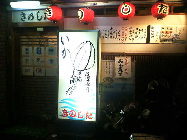 有名なのは思案橋にある「雑魚屋」ですが、今回は満席で中に入ることができませんでした。その代わりに行ったのが同じ通り沿いにある「きのした」です。長崎市内で水イカを食べるならここ!と言われている店らしく、ここも混んでいましたが、何とか席を確保することができました。写真のようにものすごく目立つ入り口なんですぐに見つけられると思いますよ。