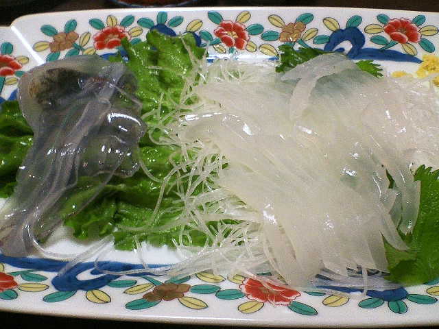 この「きのした」、メニューに値段が載ってません。水イカだったら高くても3千円くらいだろうと思いながらも、かなりびくびくして注文しました。最初は刺身にして持ってきてくれますが、そこから耳を切り取ってにぎりに、頭をてんぷらにしてくれます。体と足が刺身です。ここら辺はおかみさんがやって来てひとしきりやってくれます。時々好みを聞かれたりしますが、基本的にはコースのようになっていて刺身、天ぷら、にぎりとなるようです。目玉も生のまましゃぶらされます。この時のおかみさんの喋りが面白くて、