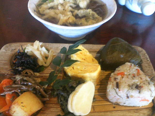 このろくべえ、飢饉のときに、島原のろくべえさんという人がサツマイモの乾燥したものを粉にしてそれで麺を作って、椎茸と昆布の出汁をかけて振舞ったという由来があるそうです。麺はつるつるしていますが、ながいもので3センチくらいなので、蕎麦やうどんのようにつるつるとすする感じではないです。ここは豪快に出汁と一緒にかきこむのがいいんじゃないでしょうか。