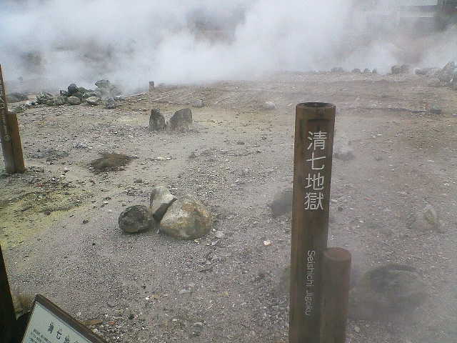 噴気や温泉の集めっているところを「地獄」と呼ぶそうです。雲仙の地獄にはいろいろとなまえがついていて、「清七地獄」、「お糸地獄」、「雀地獄」、「旧八万地獄(月面地獄)」などと恐ろしげです。写真は清七地獄です。江戸時代、キリシタンの清七さんという人が処刑されたのと同じ時期に噴きだしはじめたのだそうです。