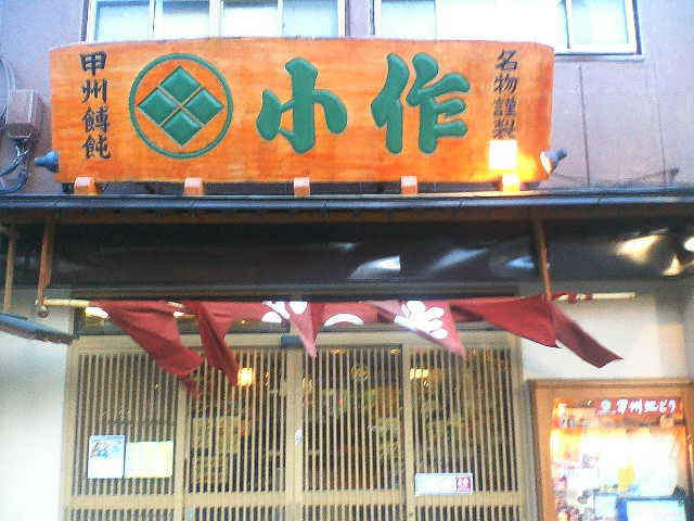 打ち合わせ後、甲府駅までもどりました。大河ドラマのおかげで、風林火山と書かれた幟がたくさん立っています。風が強いためにその中の幾つかは倒れかけていました。宿泊先の東横インの受付で甲府のお勧め料理屋を尋ねたところ通りを挟んで向いにある「小作」という店を紹介してくれました。この店、歴史のありそうな佇まいでなかなかいい雰囲気です。早速行ってみることにしました。