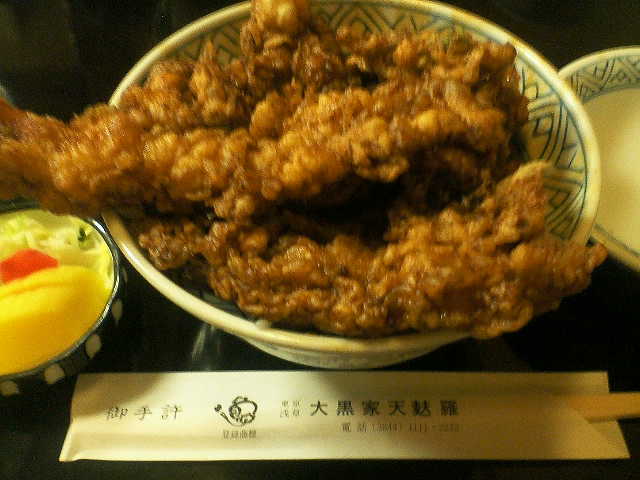 初めて2階の座敷に通されて、天丼を頂きました。写真を見ていただくと分かりますが、黒いです。初めて食べたときは驚いたものです。海老一匹、きす一匹そしてかきあげがのっています。私は、丼ものが大好きなので、かなり満足しまいました。浅草にはもう一軒老舗の「尾張屋」というのがあります。次回はそちらの天丼にチャレンジしようと思っています。