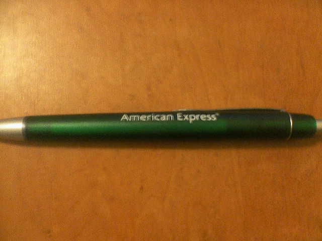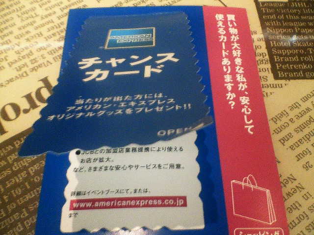 ご存知の方も多いと思いますが、羽田空港の到着ロビーと同じフロアにアメリカン・エキスプレスのブースがあります。その目の前にあるエスカレータ付近で営業のお姉さんが、クジを配っています。このクジ、噂によると全て”当たり”らしく、景品としてボールペンがもらえます。写真の”チャンスカード”と書かれたところをめくると、裏側に”当たり”と書かれています。