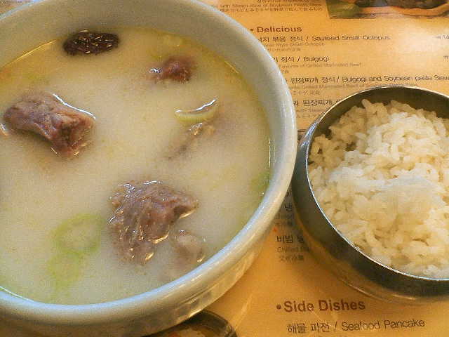 インチョン空港では、チェックインの後、韓国料理レストランに入って、食べ歩きの締めくくりの食事をしました。やはり空港価格で高めの値段設定ですね。食べよう食べようと思って今まで食べられずにいたコムタンスープを注文しました。オックステールスープですね。赤くない料理は久しぶりです。好みで塩を入れたり、唐辛子で辛くしたりして頂きます。1600円近くしましたが、大満足です。