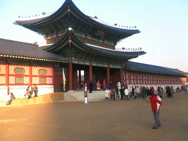 ガイドブックによると景福宮はもともと700年前に立てられた李王朝最初の王宮で、一度日本により破壊されましたが、その後再建がすすみ今の姿になったらしいです。私が訪れたときは光化門は工事中でした(残念)。写真は敬天門というところで、ここでチケットを渡すと中に入れます。門のところには守衛さんがたっています。この寒さの中、微動だにしないので最初は人形かとおもいました。