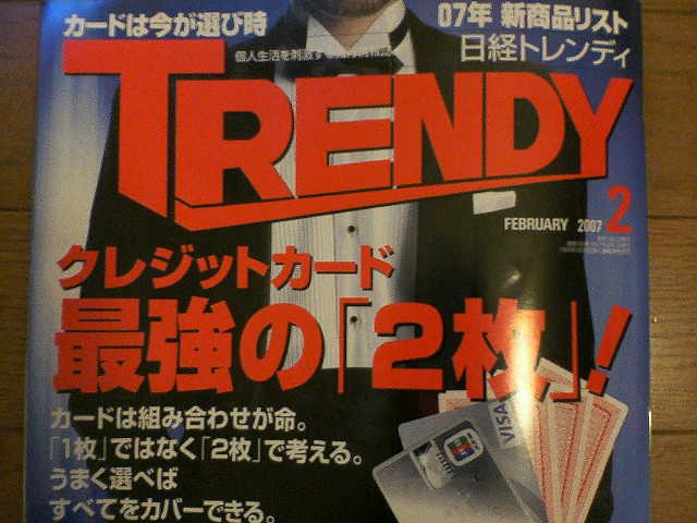 現在発売中の日経トレンディでクレジットカード特集をしています。クレジットカード最強の「2枚」!という特集で、どういったカードの組み合わせにするとお得かという話題を幾つかの視点から解説しています。この雑誌、時々クレジットカードの特集をしているんで、そのときだけ買っています。ちなみに今日は、うちの社長からもらいました。管理人がクレジットカードマニアだと知っているからですね。いつもありがとうございます、社長!!