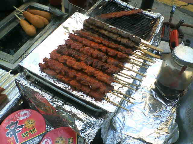 ミョンドンを後にして、歩いて景福宮(キョンボックン)に向かいました。2,3kmの距離ですね。途中で見つけた屋台で豚の串焼きを食べました。これ、屋台でよく見かけます。辛い味付けなのかなと想像していましたが、赤い色はケチャップで、ちょっと拍子抜けしました。味はそこそこといったところです。