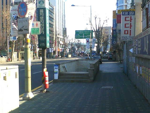 明洞(ミョンドン)に行くために地下鉄を利用しました。タクシーを使っても良いのですが一度くらいは地下鉄を利用することにします。写真は地下鉄の入り口です。日本と違って、地下に下りる階段の部分に屋根というか覆いがないんですね。地面にただ穴が空いている感じです。駅名は横の電柱のようなものに書かれていますが遠くからだと分かりにくいです。