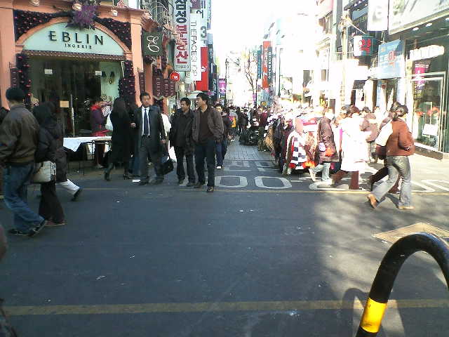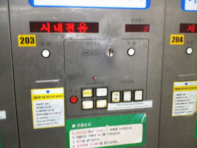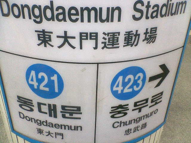 東大門運動場という駅から、ミョンドンまでは2駅です。東大門運動場は幾つかの路線が交わるところらしく正しい電車を探さなければなりません。ソウル行きという電車に載ればOKです。車中は日本の電車の様子とほとんど変わりませんね。ただ電車の中だというのに大音響でステレオを鳴らしているおばさんがいました。CDを売っているらしいのですが、だれも興味を示さないのを見てとると、隣の車両に移っていきました・・・。