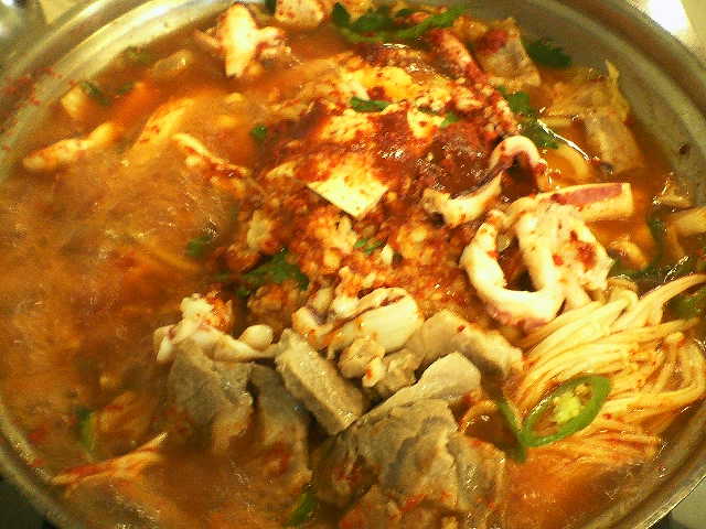 さてさて、チゲです。店にはいるとテーブルには既に鍋がセッティングされていました。これがお勧めのようです。違うものを食べたい場合は、取り替えてくれるらしいのですが、折角なのでお勧めを頂くことにします。イカが入っていて海鮮風ですね。とても辛いですが、出汁が良く出ていて、少し甘みもあります。