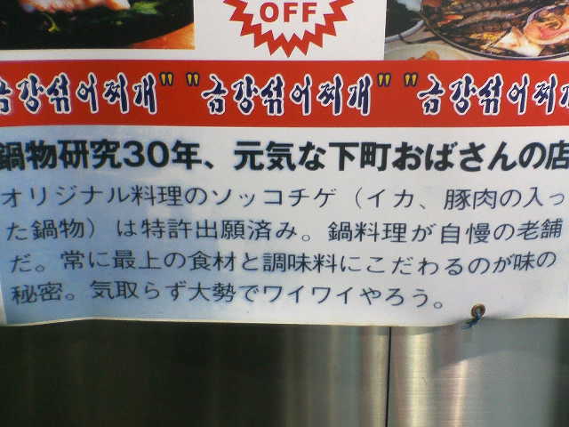 昼時に着きましたので、ご飯を食べる処を探しました。ミョンドン駅から延びている大きな通りからちょっと横道に入ると、ありましたよチゲ屋さんが。しかも、ここのおばさん、チゲの作り方で特許を取っているようです。期待できますね!ところでソウルの街全体にいえる事ですが、かなり日本語の看板があります。メニューにも日本語が書かれています。便利だと思う反面、折角の旅情がそがれてしまうような気がしてなりません・・・。