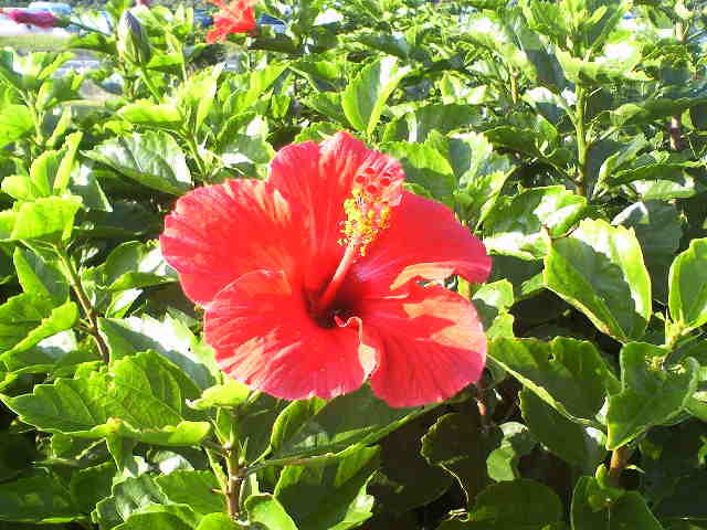 いつもと違って八丈島滞在は一時間くらいです。煙草をふかしていると観光でやってきたと思われるおばさま達が、何やら写真を撮っていました。何とハイビスカス!よく見るとあちこちに赤いハイビスカスが咲いていました。そういえば11月だというのに暖かい。