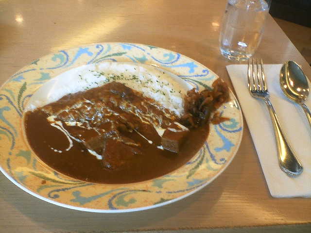 写真は「ル・シェール」で食べたビーフカレーです。店に入ったら通常メニューが机に置いてありますが、「AMEXメニューを下さい」と店員に伝えます。その時決して、AMEX定食とかタダ飯などと言ってはいけません・・・。選べるメニューはカレーライスのほかにハヤシライス、その他軽食があり、結構充実しています。どれも普通に羽田のレストランで食べると1000円くらいするメニューでしょうか。(ビーフカレーは950円と書いてありました)